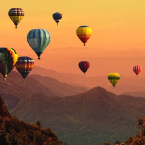 Float above the savannah at sunrise, drifting quietly as herds of elephants and giraffes roam below, a bird’s-eye view of wild beauty
